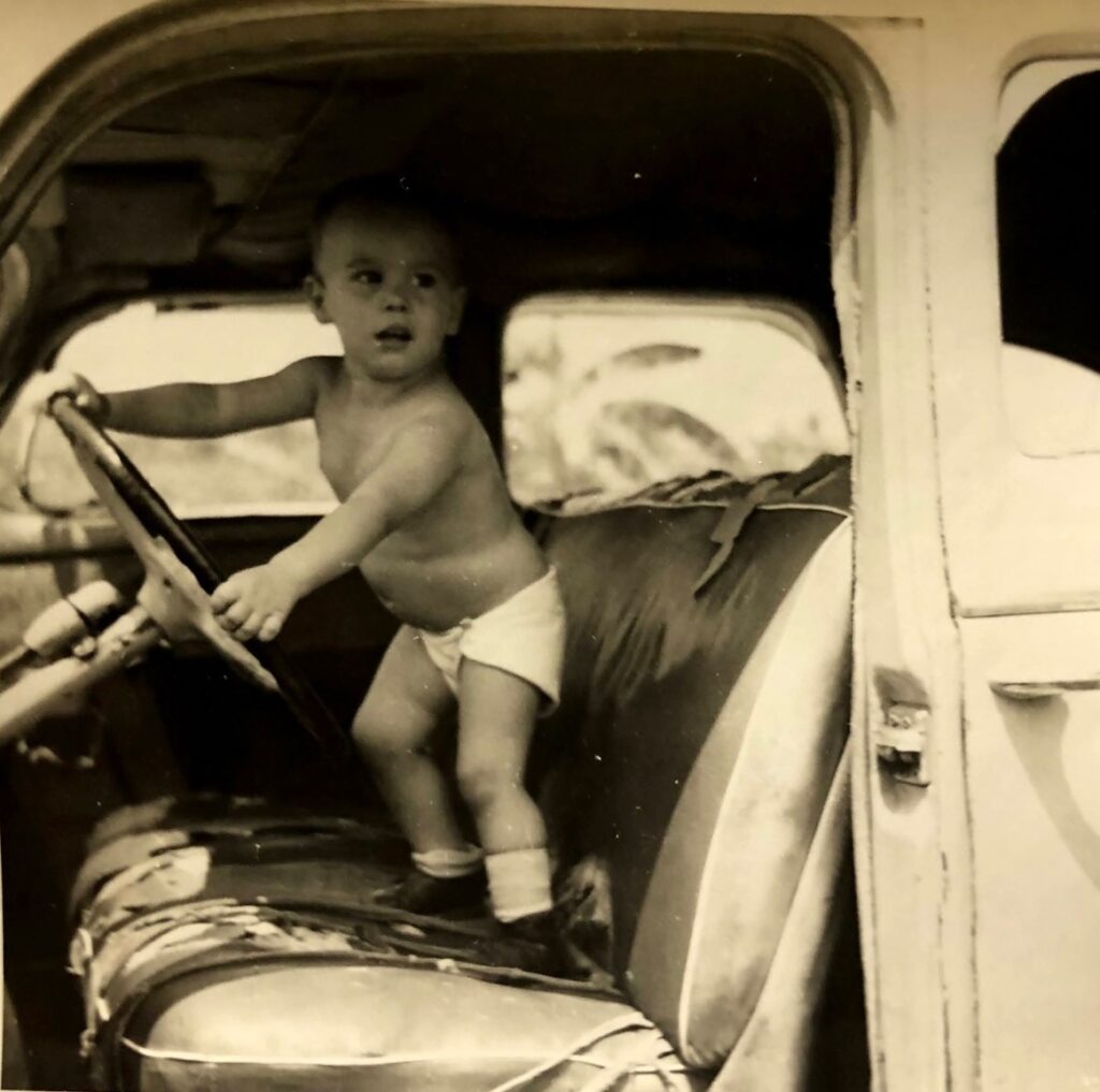 And he left me in the car and. Went inside the house somehow and I ended up yanking on the shift. ’cause I was sitting on the, uh, seat and the car started going down the hill comes out, the car is halfway down the hill and they’re like, where is he? He must be inside the car because that’s where I, I was, I had shared a photo with you that I still keep because I just can’t remember that day.
