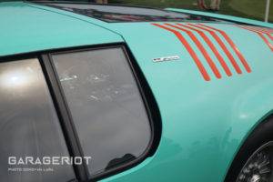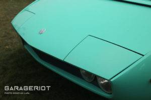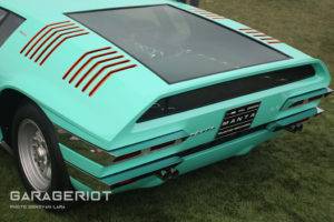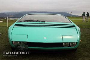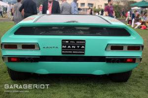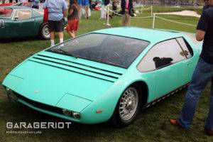This 1968 Bizzarrini Manta was built by famous designer and founder of Ital Design, Giorgetto Giugiaro with help from Giotto to promote and launch Ital Design in 1968. The car features a middle position driver seat and various creative design concepts. The chassis of the car is debatable and neither Bizzarrini nor Giugiaro remember if it was sourced from a period Corvette or the Bizzarrini P538 chassis #3. This particular car went through many evolutions and color combinations before ending up in the teal color shown today by its current owner in the U.S. It is presented here on the lawn at Pebble Beach in 2016.