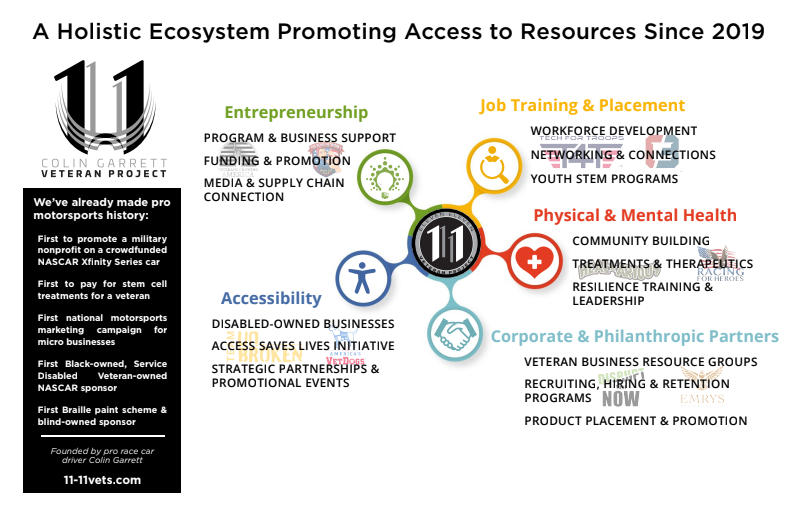 11/11 Veteran Project promotes access to existing resources that help improve the lives of veterans, military families, and the disabled by using the national platform of pro race car driver & 2023 TC America TCX National Champion Colin Garrett. (LEARN MORE)
