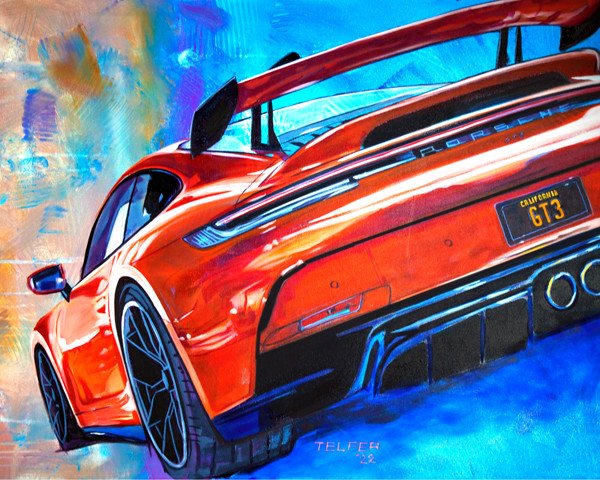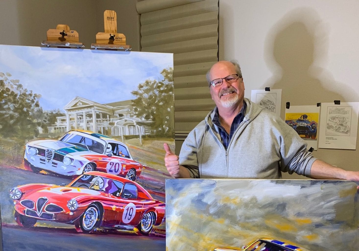 Kelly Telfer: I do have a website. I do commissions. I’m obviously like this one here. We do the Porsche dealership, their new car introductions. Sometimes I paint live. Last year, I auctioned off three paintings with a lot of help. Bill Warner that founded Amelia Island, Peter Sacks, Mario Andretti, Bootsy Porsche’s son, Mark Porsche.