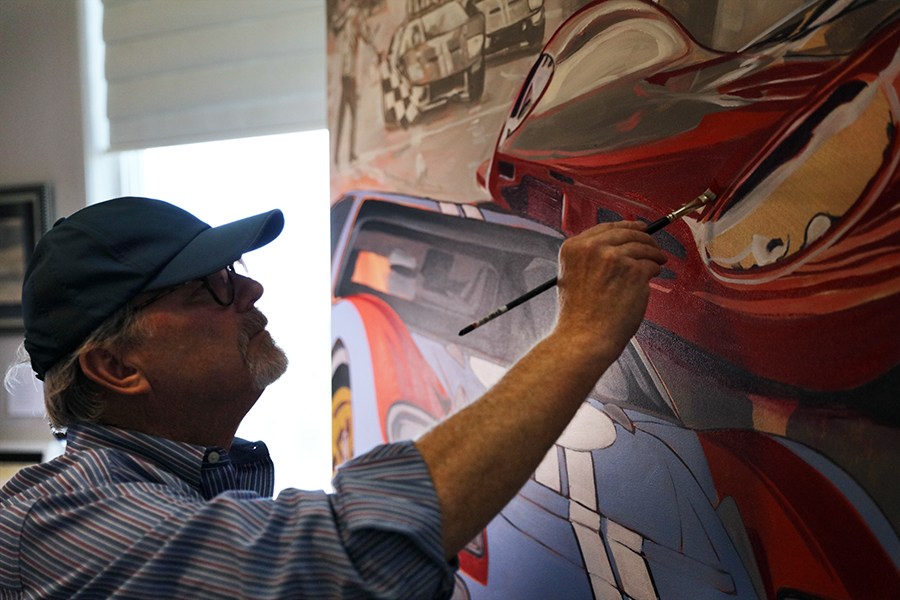 I’m an expert at computer graphics. I’m an expert at all this stuff. I’m going to go old school. I’m going to take a paintbrush and a canvas. And I’m going to go paint. I’m so passionate about art, so passionate [00:05:00] about cars. It’s just a dream come true. To be able to do work with Porsche, with Laguna Seca Raceway, the racetrack I went to when I was four years old for the first time, to be the official artist with both of these, it just blows my mind.
