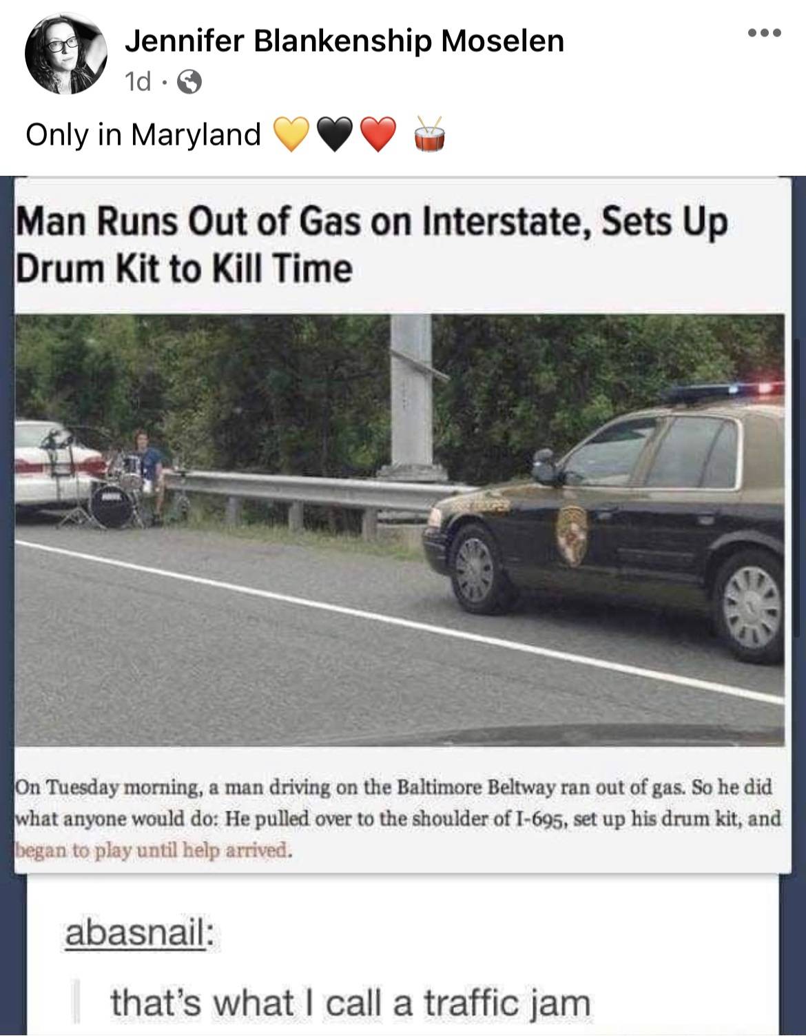 - Maryland Man ... runs out of gas, sets up drum kit to kill time
