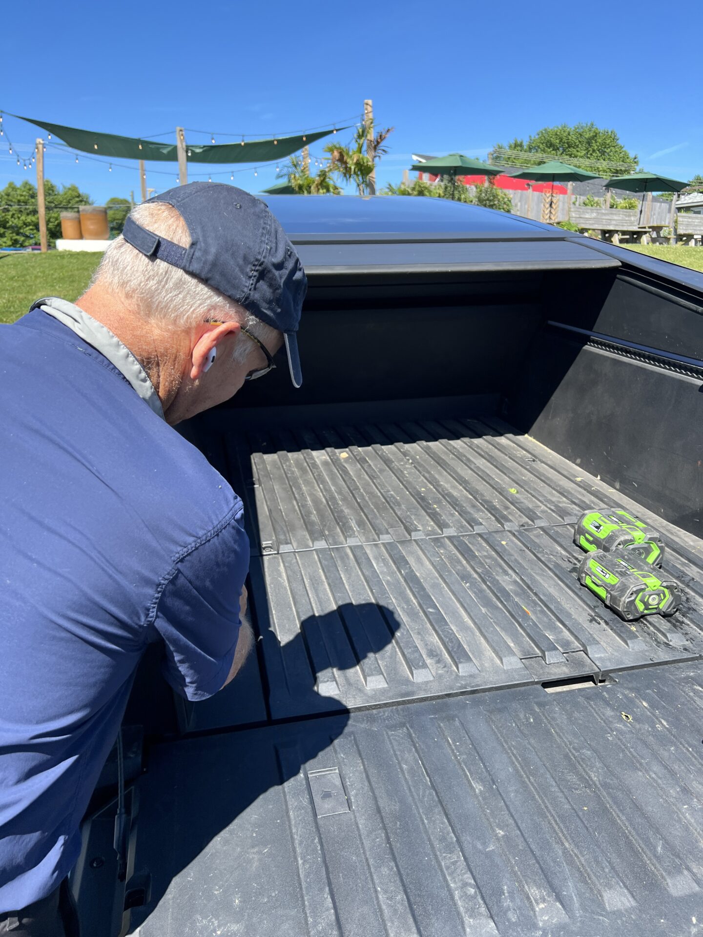 Crew Chief Eric: So get this, the buttons to operate said tonneau cover because it does retract into that rear firewall there, the beginning of the truck bed. The buttons are all long that I don’t know what to call it. Cause there’s no pillars in the Cybertruck.