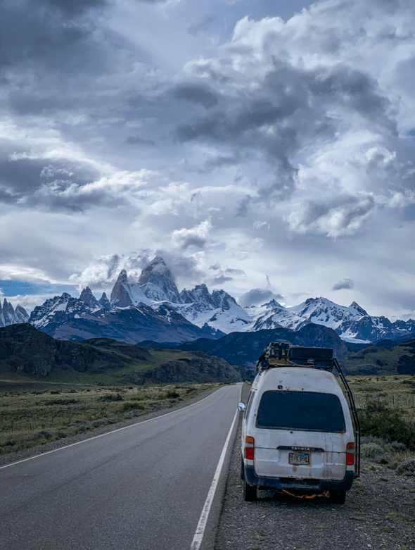 And So my first thought happened from Mount Fitz Roy. Ever since that moment, I started kind of daydreaming about the ability to drive all the way down there with some adventure. [01:02:00] I never really gave it any weight to, cause I was pursuing racing until my breakup with racing happened. It was a pretty powerful moment to be seeing my van at the side of that road from the same image that like it looked exactly the same as the documentary that we watched.