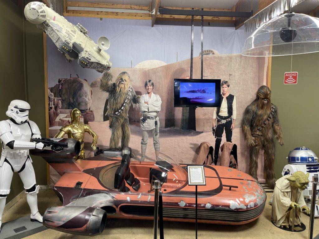 Outside, Hollywood trains from Westworld and Inception sit alongside a Harrier jet from True Lies and Avengers. There’s a Desert Storm Humvee, a Titanic-era car, and a steam-powered motorcycle that predates the internal combustion engine.