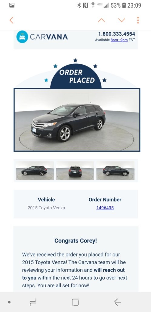 I settled on the Toyota Venza XLE, with the 3.5L V6 (it also comes with a 4 liter which I had no desire to own). The only problem I knew I might run into was the fact that Toyota stopped making the Venza in 2015 for the US market. I began searching in all the typical places that I normally would – including local dealer website inventories and Auto Trader. I dreaded the car buying process and began to put it off. Just thinking about spending 4 hours at a dealer made me not want to buy a car at all. We went on our annual fall camping trip to Virginia and I consulted with a friend of mine who spoke very highly of Carvana. He mentioned the ease of the sale and that the car he received was the cleanest used car he’d ever had in his possession. I thought about Carvana and filed it away for further research.