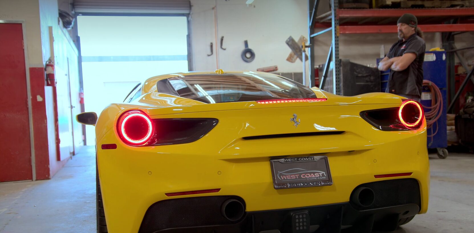 With an emphatic vinyl record scratch and the ghostly voice of Gene Wilder as Willy Wonka saying “Scratch that, Reverse it!” we do find ourselves starting from West Coast Exotics, but instead of at the exact moment we saw the dark blue 612 and black 458, we’re now talking about a “new deal” – $300k for both a satin white F8 Tributo and giallo (yellow) 488 GTB.