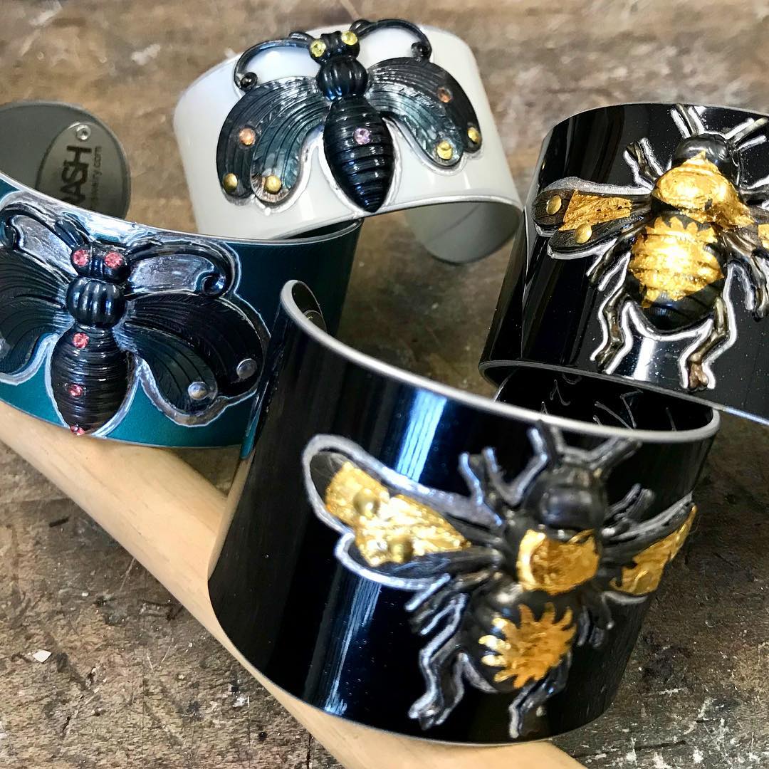 I was still making the silver and gold jewelry, but I wasn’t making anything from the cars yet. I would see these cars come in and was always admiring them. And especially the paint. Which reminded me of enamel, I just started thinking like, you know, I wonder, I wonder where this metal goes. I wonder if I can make jewelry from it took a while, you know, it was just one of those thoughts.
