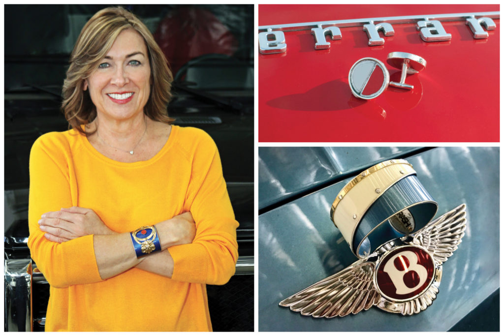 Crash Jewelry isn’t just about cuffs anymore. Christi has experimented with window sashes, resin-set fiberglass from Corvette panels, and even fashion accessories like butterfly pins made from Porsche metal. She’s also collaborated with Cadillac on a limited-edition ornament and with Lyn St. James to create a speedometer-inspired cuff supporting Women in Motorsports North America.
