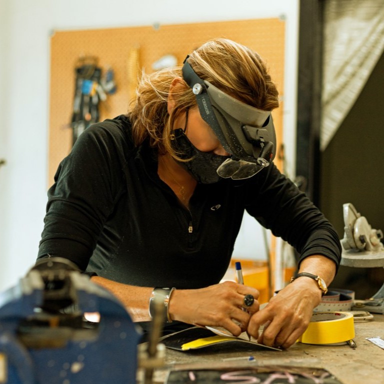 Christi’s journey began far from the autosphere. With a background in museum education and art history, she was a self-described “frustrated artist” tired of institutional bureaucracy. Her creative pivot came after marrying Dan, a body shop owner in West Los Angeles. As she explored metalsmithing, her studio slowly migrated into one of Dan’s garages – where inspiration struck.