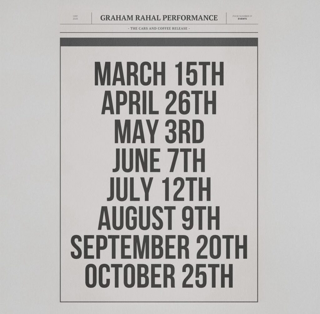 Graham Rahal Performance Cars & Coffee season is underway at GR Brands Headquarters  in Zionsville, Ohio.  As always guests can expect to see a selection of cars on display from our impressive Graham Rahal Performance dealership, as well as view the variety of vehicles on display by members of the car community! Cars & Coffee continues to be open to everyone.  Whether you are a car enthusiast or a total novice, we hope you will join in on the Cars & Coffee experience!  This event is also open to people of all ages, so please feel free to bring the whole family out!