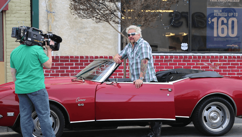 - On the show (Triple D) Guy Fieri is always seen with the Camaro; why that car? Is it the “most American” – why not a mustang?