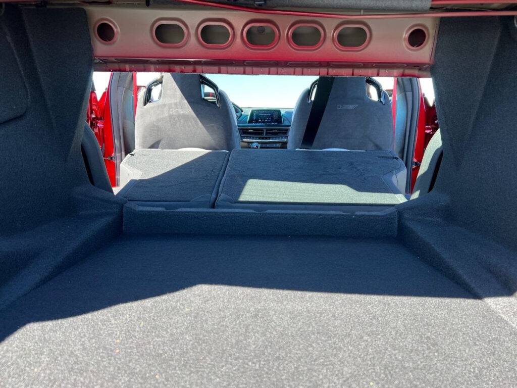 So, I set the driver seat for my frame – representing the real world and climbed into the back seat. OK – it’s a bit tight. I’d ask the driver to move the seat forward at least 1”, maybe 2” so I could find a comfortable seating position. Yeah, I’ll just say it – the back seat is a bit cramped for many adults. But wait, I’m thinking that a buyer of this car is needing those back seats for a run to a concert with friends, NOT a tour with the kids to Yellowstone. Thus, it’s very possible to rationalize the back seats as adding utility to a sports car that will make the V more useable more of the time. And actually, you’ll be right…the back seat is usable, just not spacious.