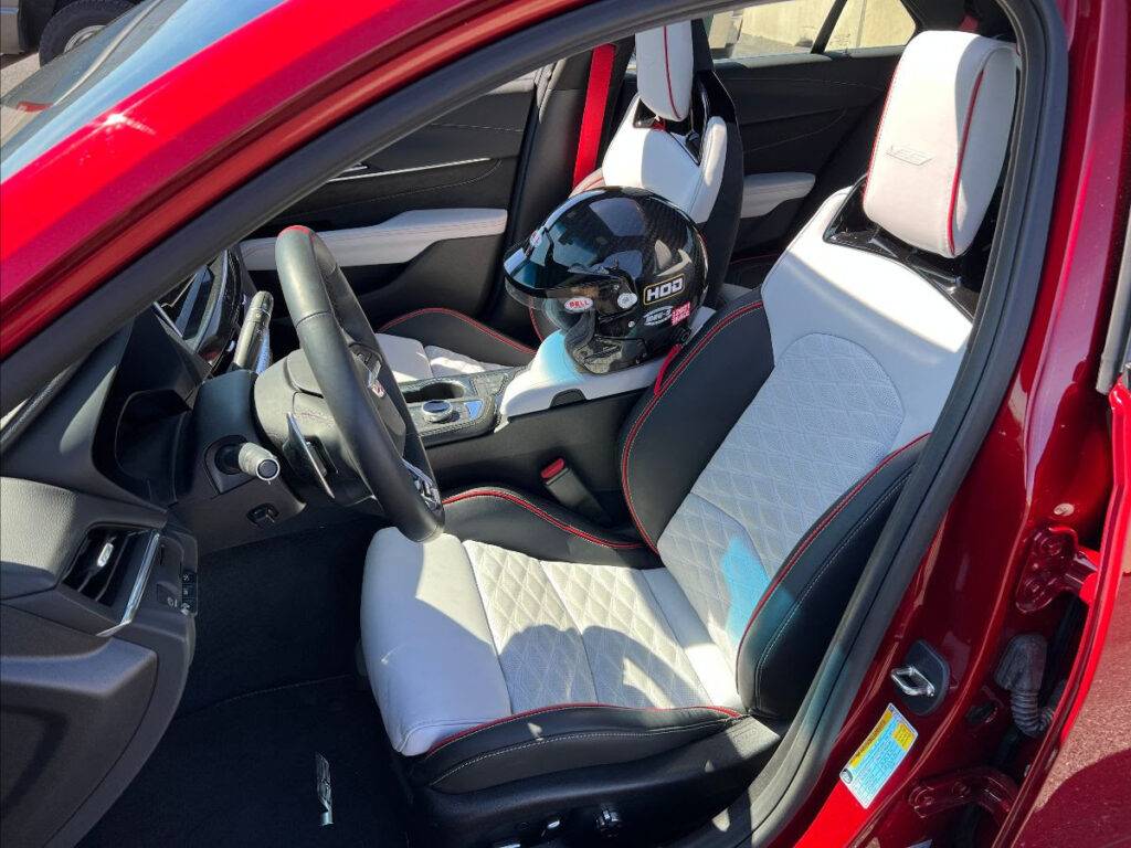 The power is awesome and sneaky fast. With the many shifts going on upon full throttle, the driver better be paying attention or things could get out of hand fast…literally. And, THE V TURNS! Understeer is probably the number one limitation to most street cars when taken naked to the track. The Blackwing has the best turn-in of any street car I’ve driven, short of high-end exotics or track-exclusive models. I literally felt the BITE of the front tire on the loaded side upon initial steering input…no tendency to push! Certainly, I must have found a speed that the V liked, but I felt I was carrying good speed and was prepared to modulate with any understeer, but it was not a problem. Just unwind, wait on the throttle, let it rotate, and squeeze throttle…a proper handling car!! Trail braking was very rewarding with the V. At Thunderhill, in turns like 2, a carousel, 14, a sharp right hander after a heavy braking zone, and 1, which takes a good brake tap, but then needs to bit of throttle at 90 mph to make the upsloping, soft 90 degree left hander, all felt natural to trail off the brake as I transitioned to throttle. Never did I feel that I’d overpowered the entry, and always I felt the car come around under control to catch apexes. (Maybe I could push it a bit harder? But this is a review…not gonna shred tires). Yes, this is a tall car to be on the track, and there is body roll to manage. In that way, that back seat and trunk are a price to pay…the lean does provide a limit when the suspension seemed capable of doing more. But – yes – this is a nearly 4000 lb car, and yes, there is inertia that must be dealt with. By the way, the seat is GREAT for gripping for dear life while restrained by only a three-point belt.