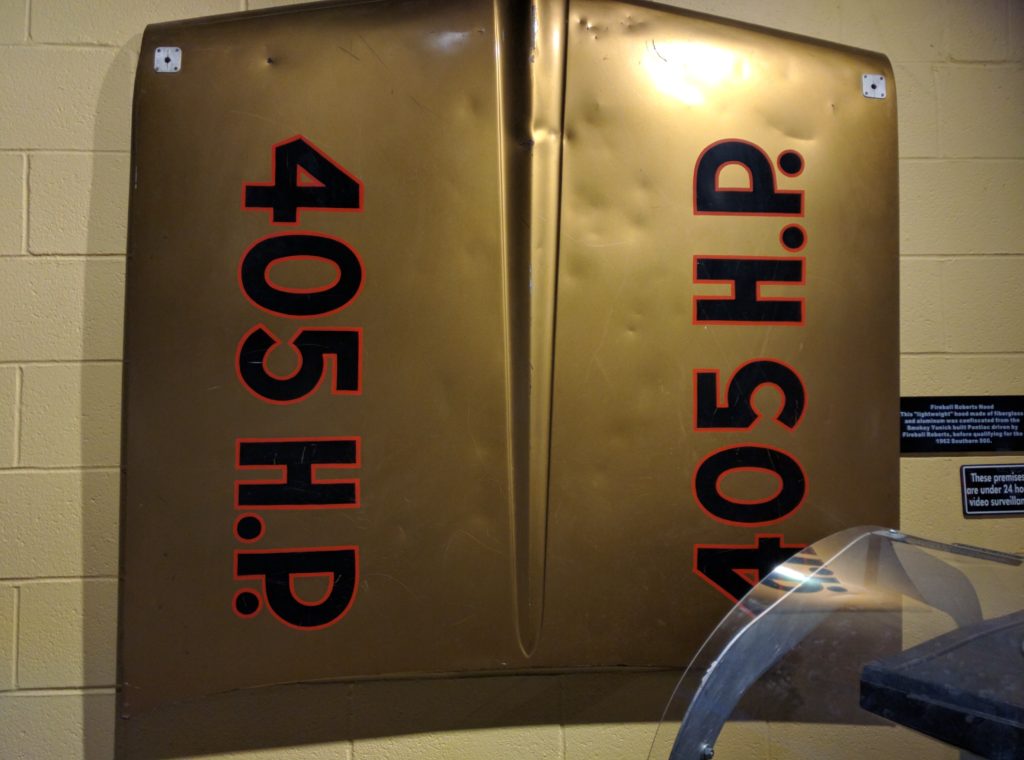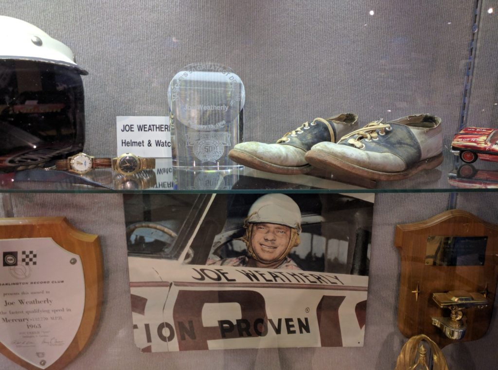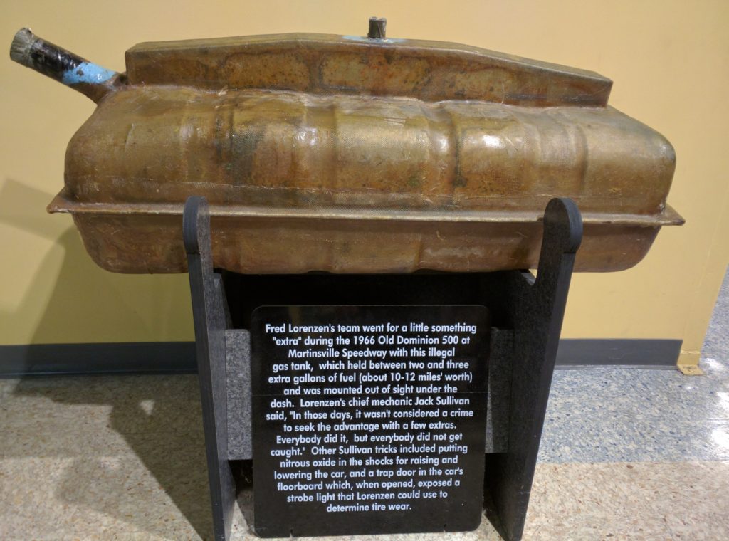 The Joe Weatherly museum offers a cabinet with a picture of Joe, some of his famous shoes and trophies. Alongside is a rare and fascinating exhibit of components constructed with the specific purpose of cheating, i.e. making the cars better than stock. Included is a special Smokey Yunick Pontiac hood, which appears to be steel, but in fact is a clever amalgam of papier mache and aluminum – making it far lighter, and hence the car faster, and an extra gas tank, fitted under the dashboard, thereby giving Lorenzen’s Hollman-Moody Ford an extra two laps of fuel. How much did these things – and other cheats surely missed by NASCAR inspectors – contribute to Fireball and Lorenzen’s success on the superspeedways?