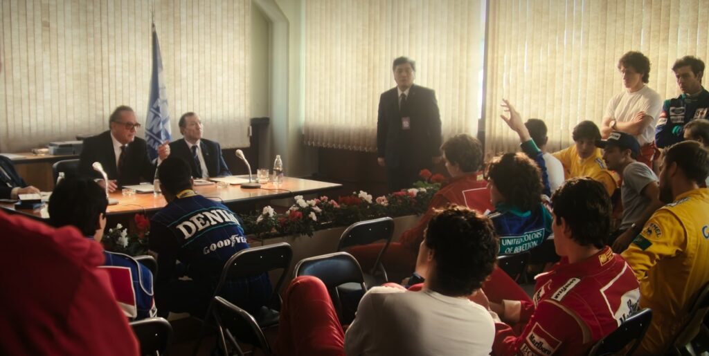 However, the reenactments of the press conferences and interviews sourced from available file footage were perfectly executed. And if you were wondering, disgruntled drivers versus FIA management (seen above) at that time were par for the course, if you look over F1’s history. It stems from pioneers for F1 safety like Sir Jackie Stewart constantly going to battle against the establishment during the ’60s and ’70s, at the risk of being suspended or worse, banned. Even in period for Senna, this was just “more of the same” (including throughout Max Mosley’s time at the helm as Balestre’s replacement). As motorsports enthusiasts we just continued to grin and bare all of it. There’s even a point where Ron Dennis comments that Balestre needs Senna to remain in F1 because “its good for business”; despite Senna’s outright and flagrant opposition to “politics and stupid decisions” on the part of the FIA leadership.