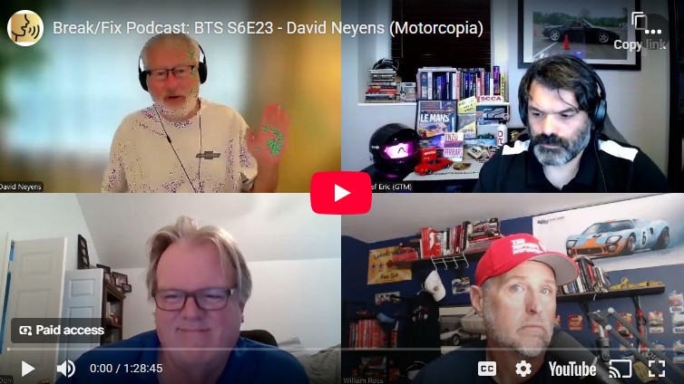 Crew Chief Eric: Folks, you’ve probably heard Brad say many times that you can sign up for Patreon for free, and there are lots of great extras and bonuses for you to enjoy, but there are folks in our community, friends of the show and sponsors that have gone the extra mile and donated to help support the Motoring Podcast network and shows like Break Fix and the drive through.