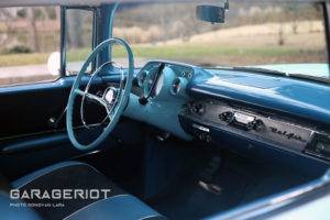 The first thing Ralph says to me when I get in, after I ask where the seat belts are, “No seatbelts. You’re in the danger seat too. I at least have the steering wheel to keep me from flying out of the car.” Seat belts were an option in 1957, although Chevrolet was the first manufacturer to offer them starting in 1956. Luckily we weren’t driving far. I couldn’t help but notice how small the car is inside. 57 Chevys have always looked very large to me from the outside. Maybe it’s the long fins and the tall front end of the car that deceived me, but the interior is actually much smaller than it seems.