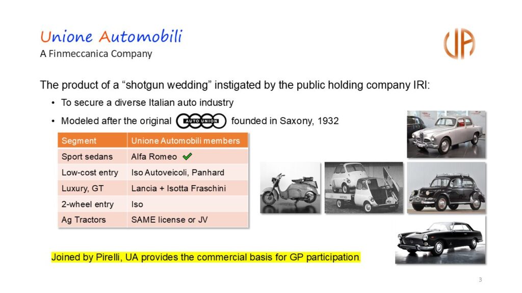 So I suggest something like this, and. Bil should, uh, happen in northern Italy and it would be where, you know, out in Germany was pretty much mandated by the banks that they had to support the capital in Italy, the IRI, the state holding. To which Alpha Romeo already belonged, would be a good vehicle to provide some serious competition to fiat, which totally dominated the uh, Italian auto scene volume wise and value wise, something needed to be done because frankly, I think people with some foresight knew that companies like ER and Alpha Mayo.