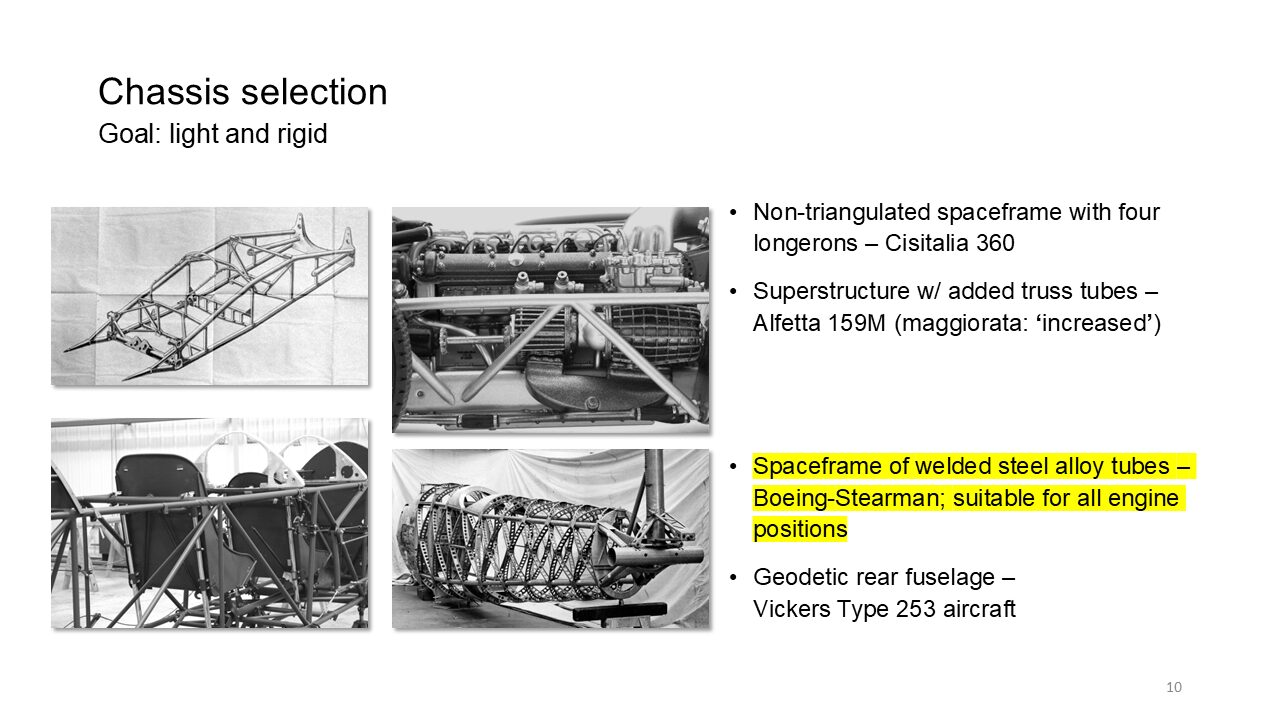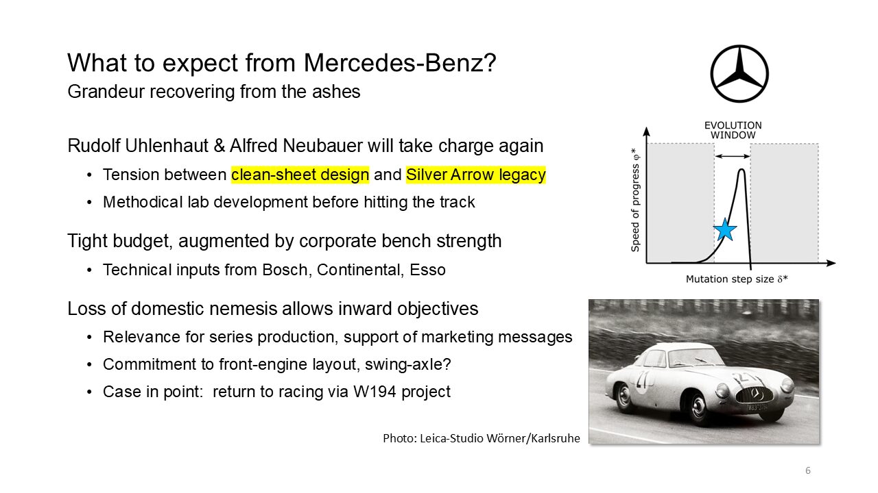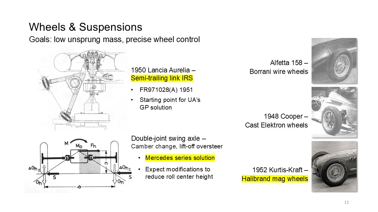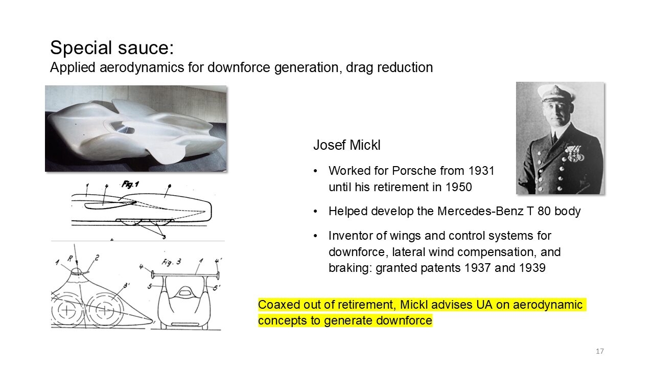 For example, mid-engine layout as opposed to what is most likely mercedes’s solution, the front engine. And then as mentioned before, aeronautics holds. A lot of nuggets of wisdom and a lot of technology pieces you want to adopt. So you won’t send out people like Ka Kitty to snoop around what’s going on in aeronautics and at the universities that still teach that there wasn’t too much actual building and designing going on after World War.