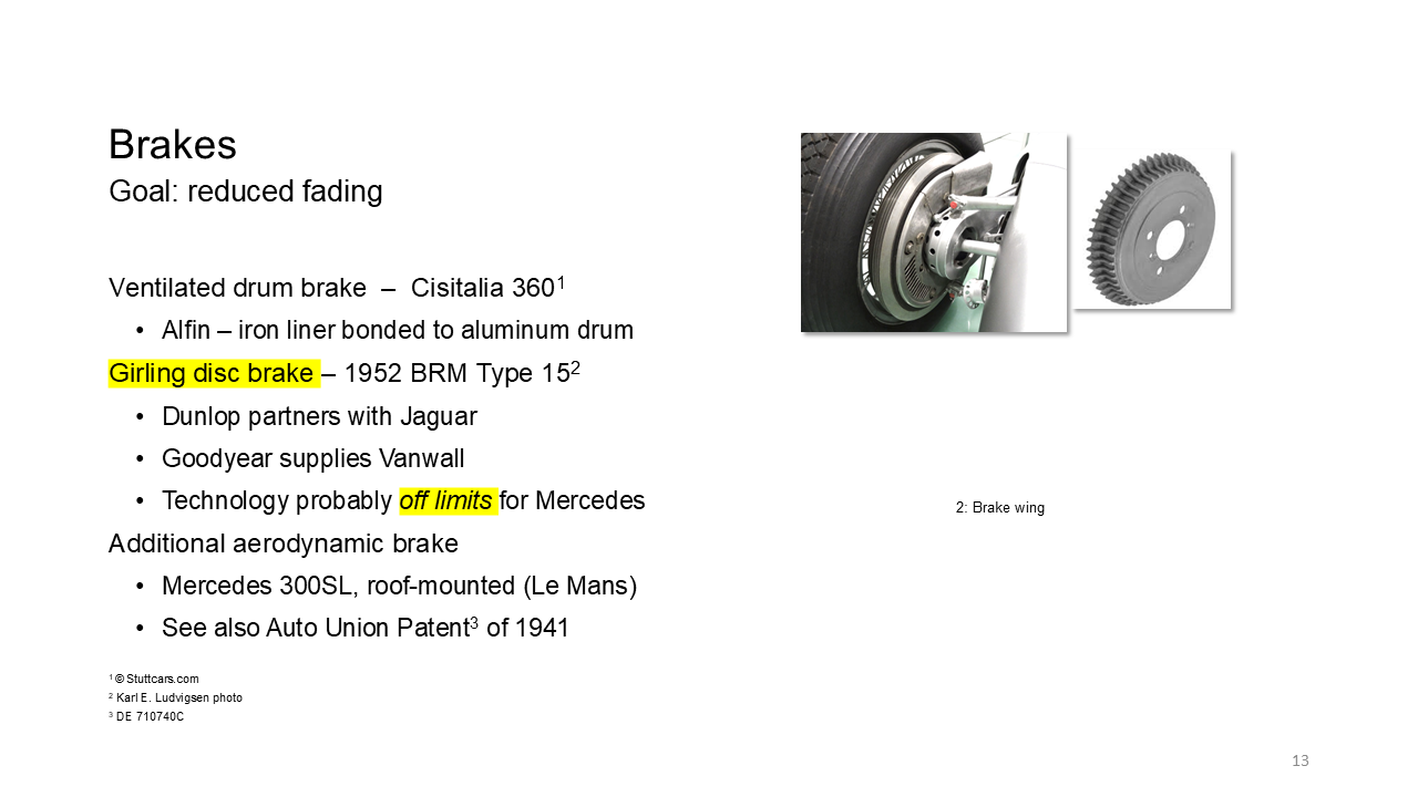 Brakes of course are important for the race car. What can you do there? Obviously, ventilated drum brakes were the industry standard fin processes were often used to bond strongly and have a low thermal resistance between the iron liners and the aluminum body. With fins, different shapes of fins. [00:39:00] But by 1952, disc brakes became already a possibility for race cars.