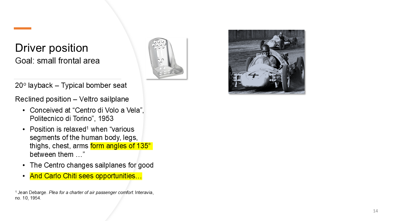 So it was a bit of an aberration. He needed that kind of seating position. But you can see [00:42:00] here it’s unfortunate. It’s, uh, not the optimum solution when you have a rear engine or mid engine. In our case. On the other hand, what we learned from aeronautics, and particularly from glider planes or sail planes, there was a development going on at the, uh, polytechnic in terrain in, uh, 1953 in particular, there was a new Chro d Olo Avela that was founded, and it was kind of an operation in the corner of a lab first.