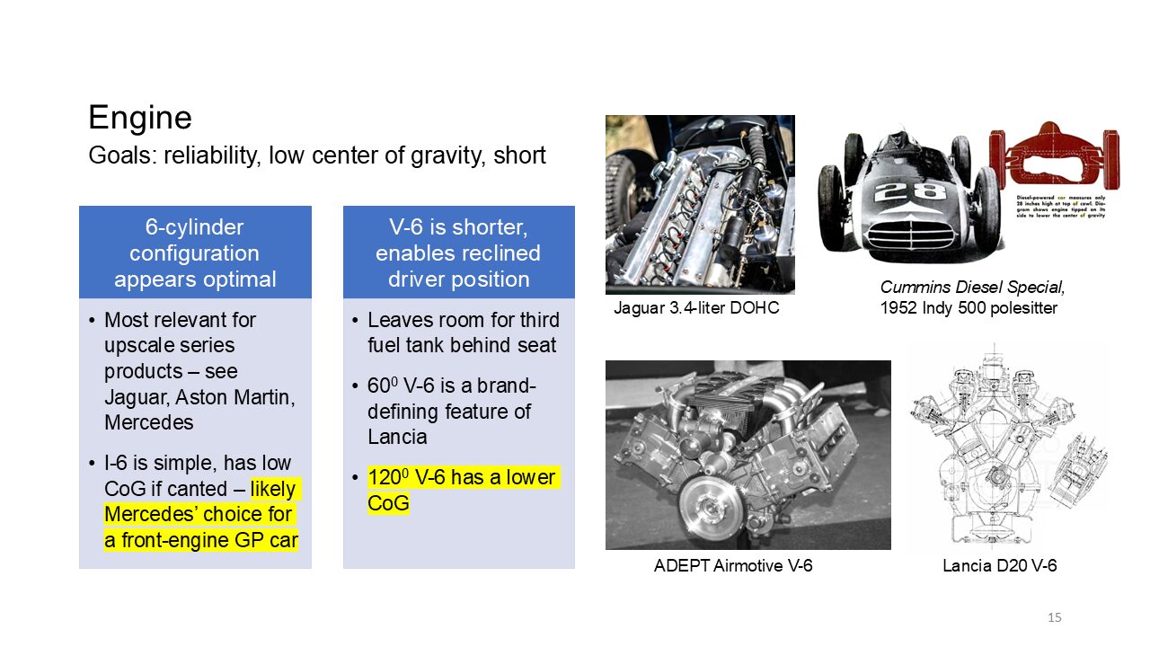 Degree V six cylinder engine, just to show you what the, the form factor would look like. I think that would give a pretty optimal [00:47:00] configuration for a, uh, mid engine configuration that minimizes the frontal area and the, uh, a drag coefficient. That’s it. So we assume that Mercedes will do this and, and use an inline six system, which we can’t know at the time that that was the wrong assumption.