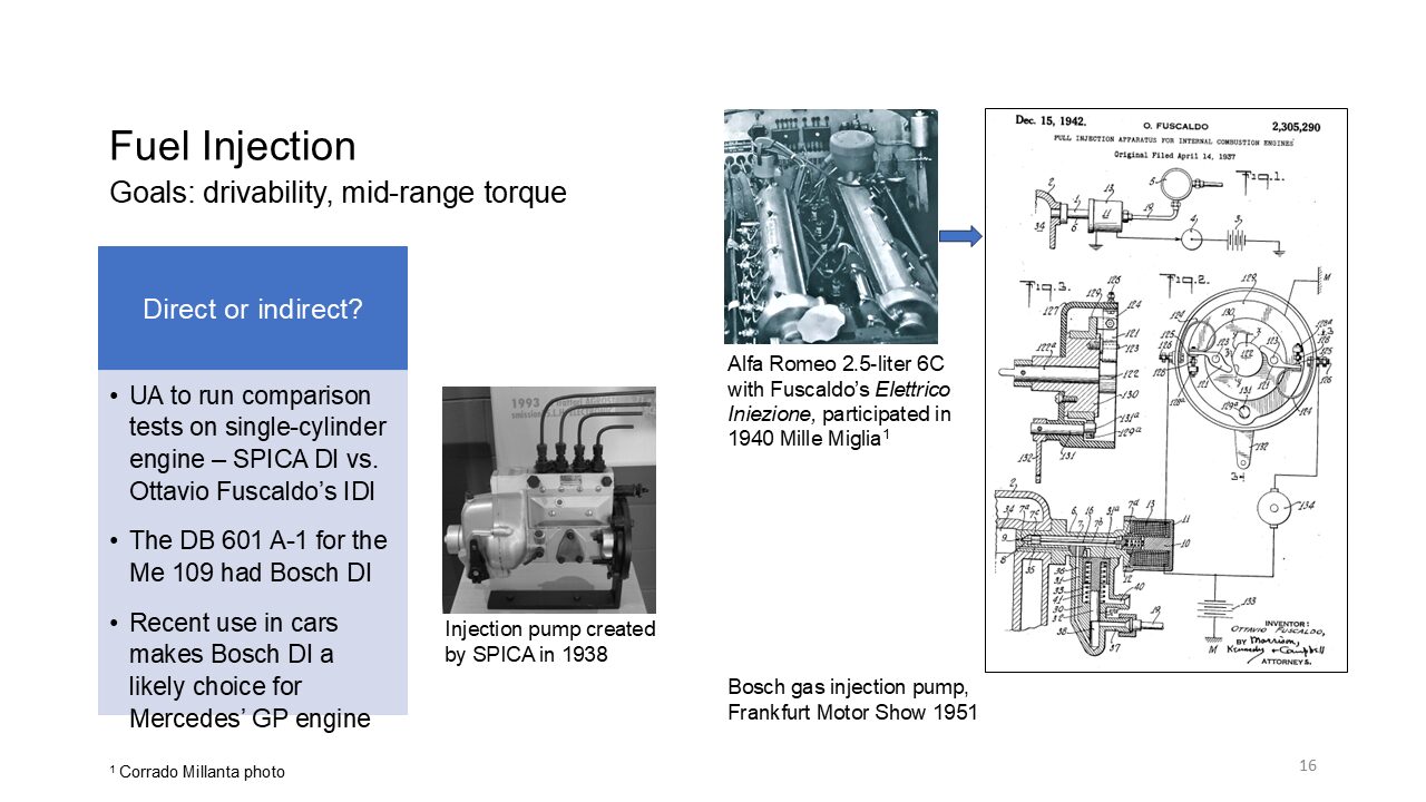 Mm-hmm. Called Good Broad until he got through his deification process and then could join Mercedes again. [00:48:00] Very likely that he would push for an adaptation of this kind of injection. On the other hand, Italy had quite a lot to offer in terms of indirect uh, injection. Fellow Avi Fudo had patented the application in in 1937, a solution for.