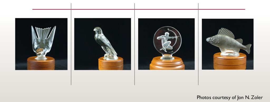 You may have seen some of his collections, if you’ve ever been to the Auburn Core Dusenberg Museum, where he has a lot of beautiful American examples on display in the past. He’s also lent us his lovely glass mascots, so not just lik but. Sabino and Che. Just beautiful examples. And Mr. Zola also self-publishers catalogs of his collections, which is just a real boon to having documentation.