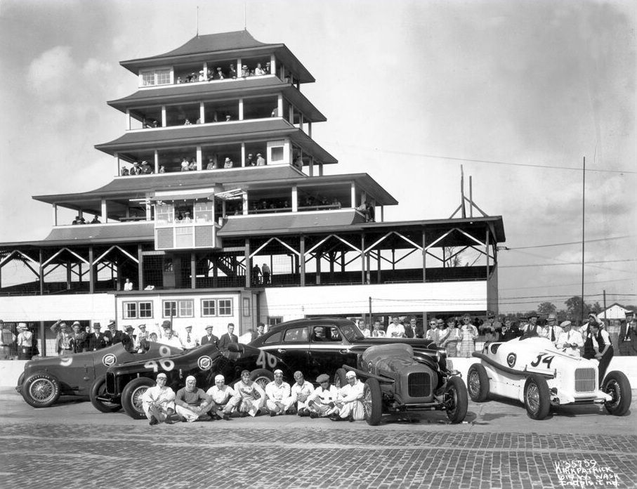 And this shot, of course, in front of Indy’s iconic Gota. And representation of the Pierce Aero connection here, too. We see in the back one of the Pierce Aero silver Aero show cars. Piercero built these for the 1933 Auto Show Circuit. They only built five. These were actually built in Studebaker’s Experimental Body Shop in South Bend, and, uh, one made it down to the Speedway for publicity purchases at that time.