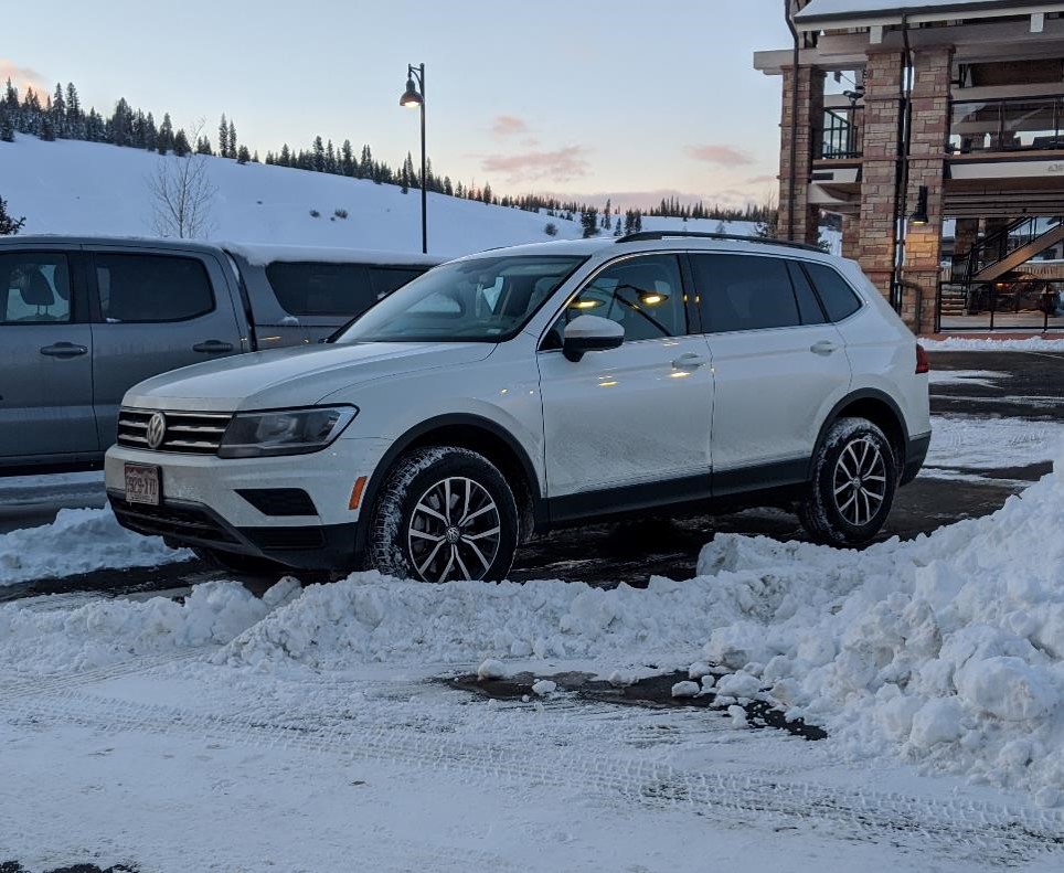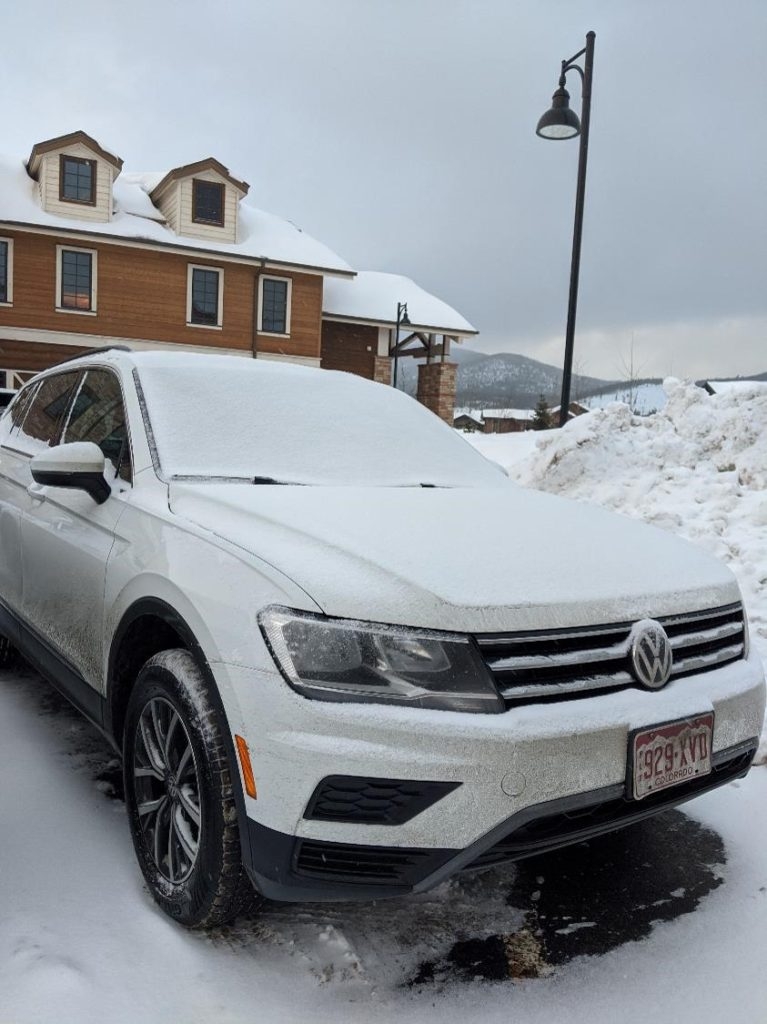 I hemmed and hawed a bit about going to Colorado for this trip and whether to rent a car or use the shuttle system from the airport to the mountain. In the end, I opted for a rental given where I was lodging and my flight times, I wanted the flexibility to be on my own time. Not unlike the last trip, I arrived at the rental car facility hoping for a four wheel drive! Only to be disappointed to see my choices were Dodge Caravan, Dodge Caravan, Dodge Caravan, Nissan Altima… oh wait! – there was a VW Passat! Which I debated for a second, until another traveler swooped it up. Looking at my choices, I was probably going to go with the mini-van figuring “big and heavy” would probably be more helpful in the snow. Disappointed, I stood around waiting for my friends to meet me before completely claiming the burgundy Dodge Caravan. Taking what seemed like an exorbitant amount of time, my friends finally meandered over. We all looked around the lot, shrugged, and said: alright (sigh). Just as I was about to start loading my skis into the van, I took one last look over my shoulder, and “aaahhhhhhh” what a site to behold! A VW Tiguan!? Can it be??