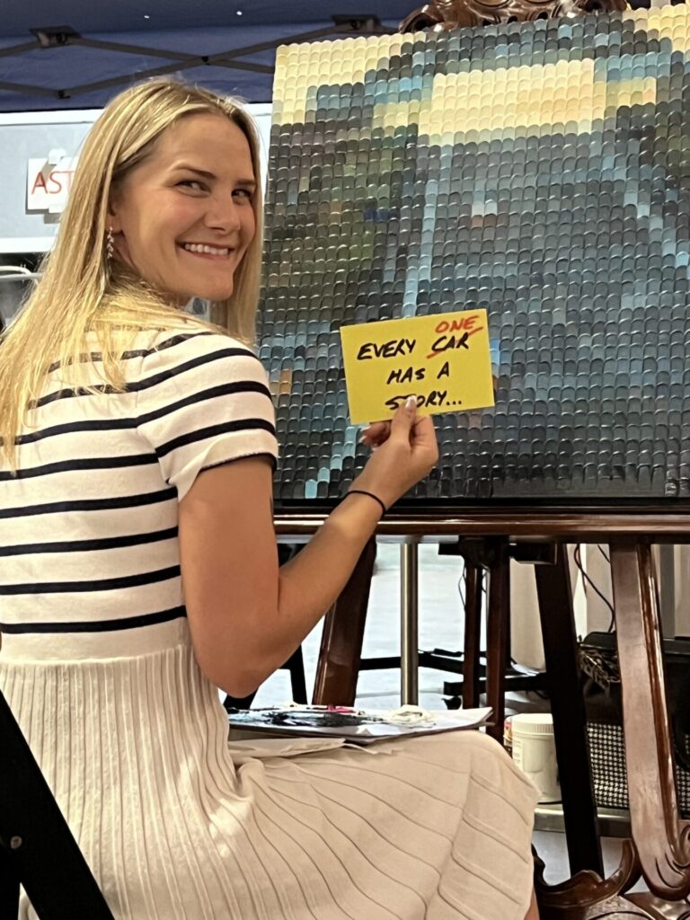 Zimmermann’s paintings are often mistaken for photographs – and that’s by design. Her process is meticulous: she begins with a soft-focus background to create depth, then layers in the car with painstaking attention to light, shadow, and shape. “I average about 100 hours per piece,” she said. “Some take over 200. The Lowenbrau 962 behind me? That was 220 hours.”