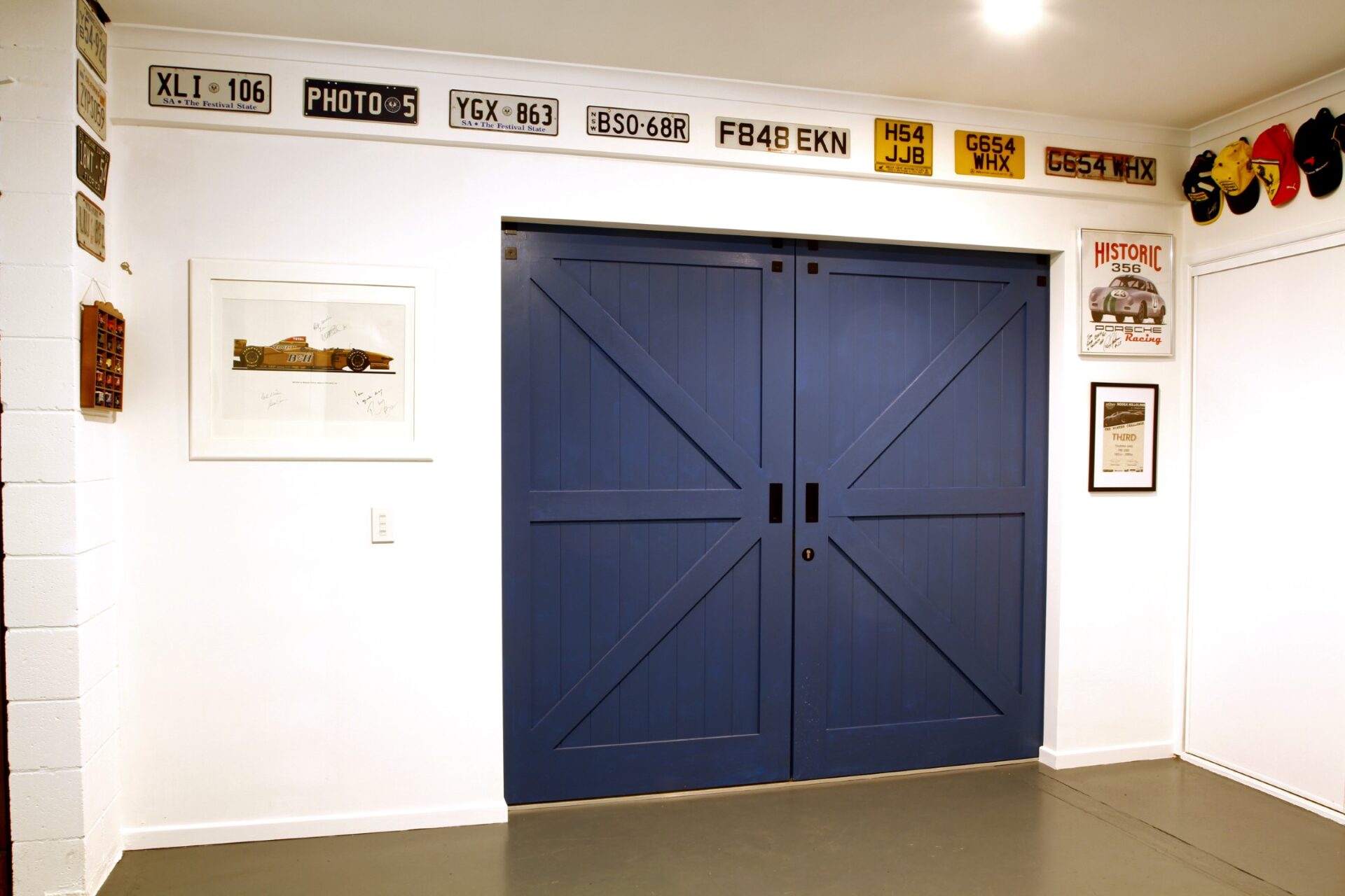 To make it work, the concrete floor was prepared and painted with industrial-strength grey paint, the walls were treated to a stark white, crown moldings add a touch of homey elegance to the space, recessed can lights illuminate the room sharply, and vivid blue was used on the big sliding door that separates the main house from the parking room. The blue is a great idea, it’s subtly bold and draws the eye, lending a visual anchor to the space. Iain has hung two of his racing bicycles on the wall, a number of hats, some pictures, and license plates from around the world. In all, it’s a wonderfully clean environment, not overpowering or understated, but perfectly balanced, even centered in a way, thanks again to the blue door.