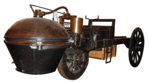 But the honor of “first automobile“ actually goes to a a french inventor: Nicolas-Joseph Cugnot who intended to build a machine to help farmers move heavy loads around more easily. What he ended up with was a full-size and working self-propelled vehicle (above) called the “Fardier à vapeur” — a steam powered “car” in 1769. And if you couldn’t tell, it was front-wheel-drive! Credit for the first “car accident” also goes to France, when one of the Cugnot machines crashed into a stone wall in 1771 – LOL.