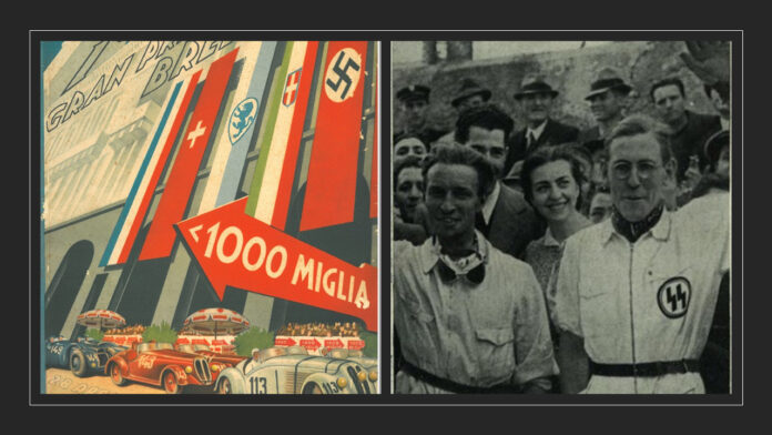 The large Nazi contingent that accompanied the BMW team were on full display, and the single most famous photograph is of the race winners waving to the crowd. Featured prominently on von Hanstein’s, racing overall was the symbol of the SS. In this way it can be said that the new Mille Miglia had actually become the Axis Grand Prix, and thus did in fact maintain its character.